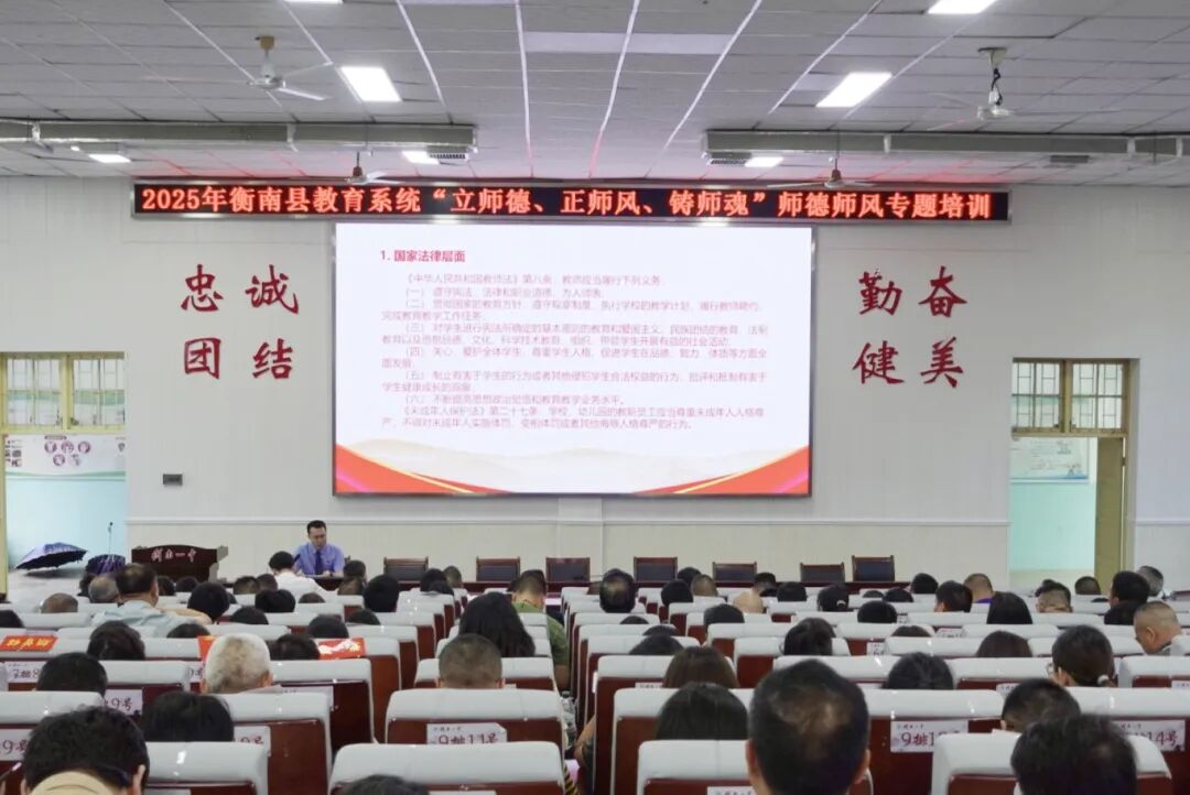 百年大计,教育为本,教育大计,教师为本,教师大计,师德为本。为强化教育工作者的法治意识,筑牢师德师风底线,推动学校依法执教,依法治校,切实保护在校未成年人的合法权益,5月23日上午,衡南县人民检察院党组副书记、副检察长郭飞受邀为衡南县教育系统的教职员工讲授“专属”法治课。全县各中小学负责德育工作的副校长等150余人参加此次培训。