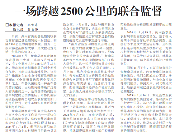 日前,湖南省衡南县检察院收到吉林省东辽县检察院的一封回信。相隔2500公里的两地检察院,因为一份线索移送函攥指成拳,形成推动规范活牛贸易的监督合力。