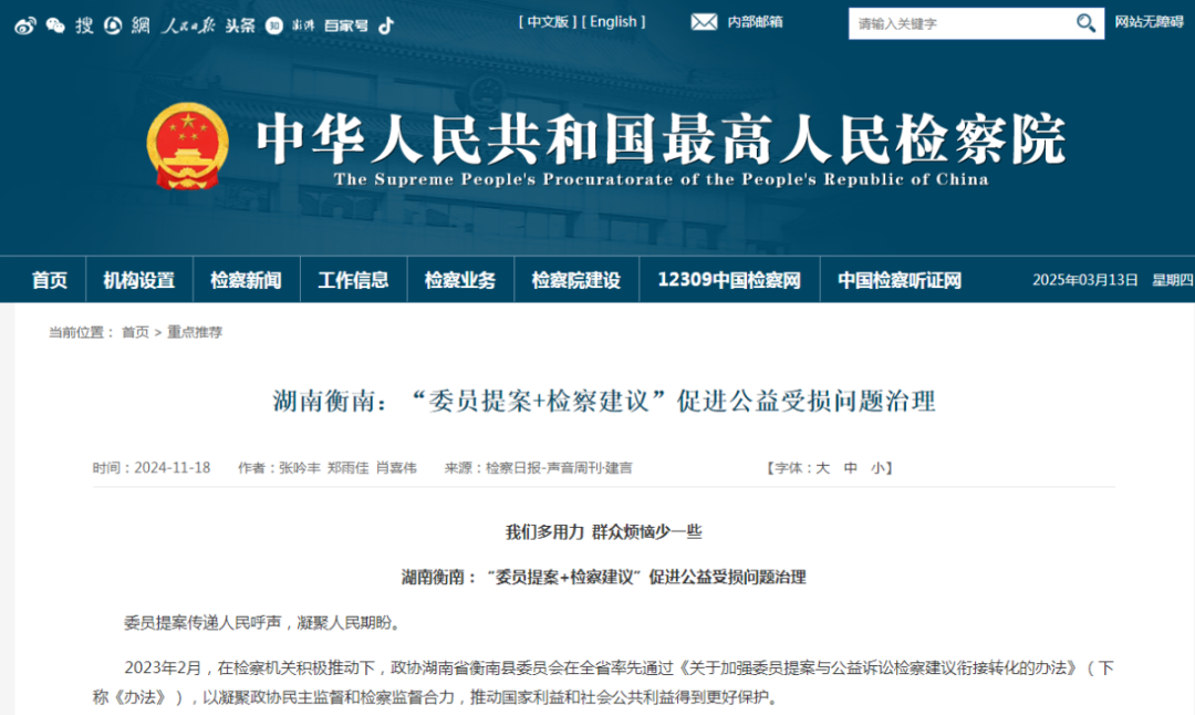 截至2025年2月底,衡南县共有8件委员提案转化为公益诉讼案件办理,公益受损问题全部得到有效解决;2个从检察公益诉讼案件中发现的社会治理性问题,转化为委员提案办理后,取得满意成效。